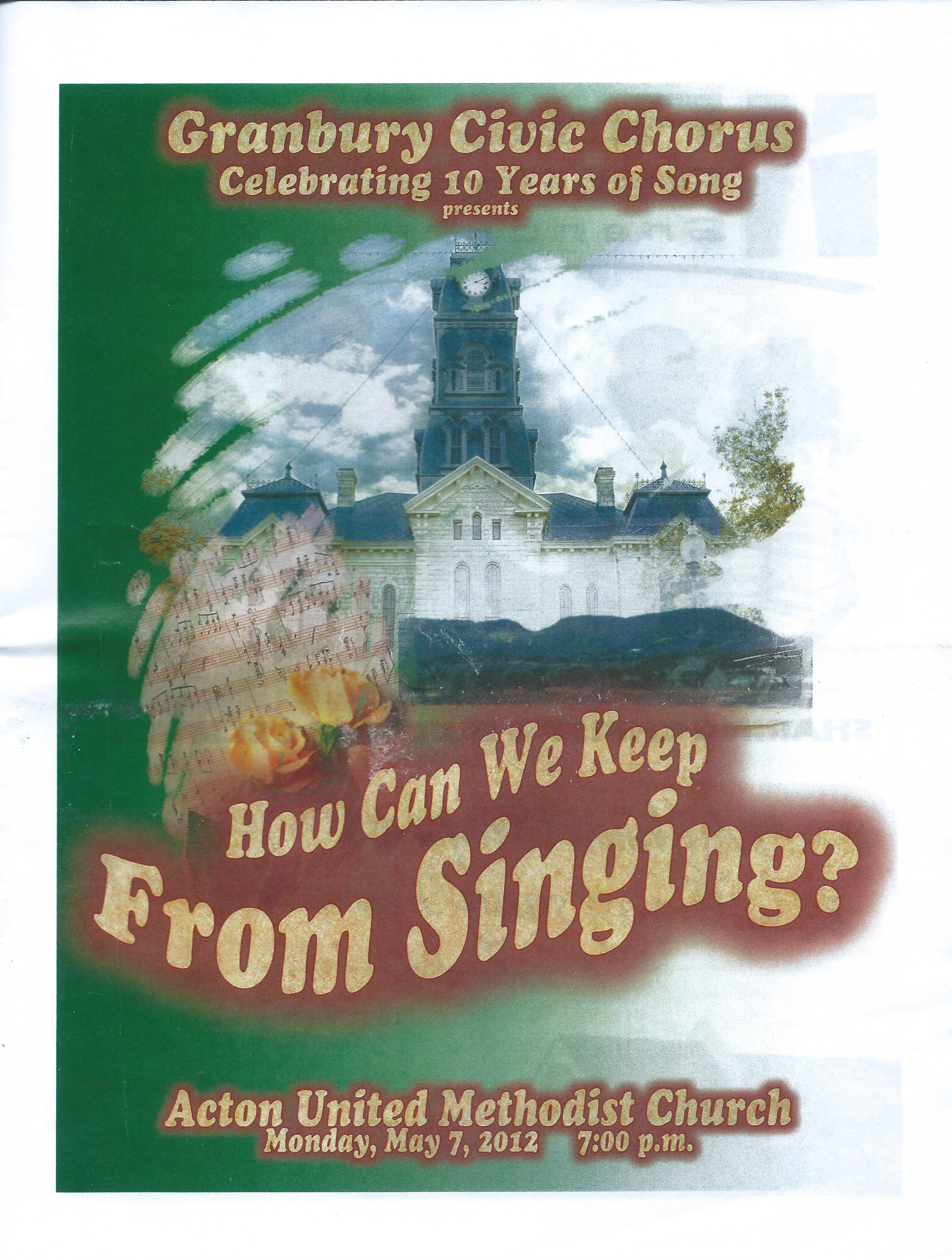 May 2012 — How Can We Keep From Singing? Posted on May 7, 2012July 28, 2019 by saraesmithcharternet Conductor – Greg Doss | Accompanist – Sandra Hearne Performed: Monday, May 7th – 7:00 p.m. at Acton United Methodist Church Share this: Share on X (Opens in new window) X Share on Facebook (Opens in new window) Facebook Like Loading...