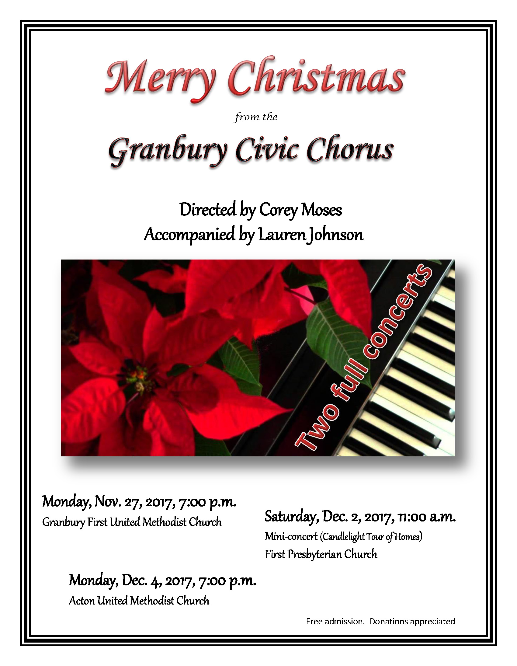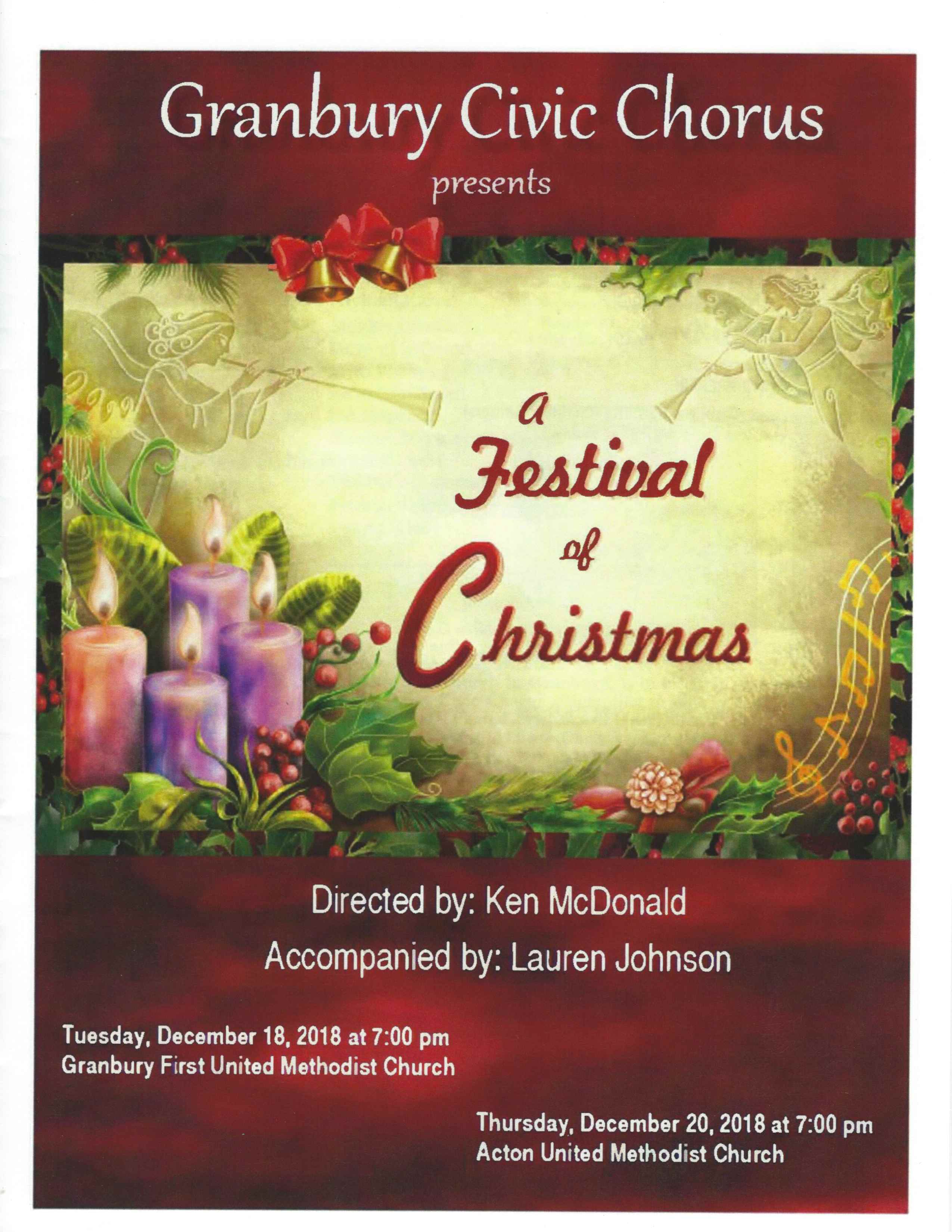December 2018 — A Festival of Christmas Posted on December 27, 2018July 27, 2019 by saraesmithcharternet Director – Ken McDonald | Accompanist – Lauren Johnson Performance: Tuesday, December 18, 2018 at 7:00 PM Granbury First United Methodist Church Thursday, December 20, 2018 at 7:00 PM at Acton United Methodist Church Like Loading...